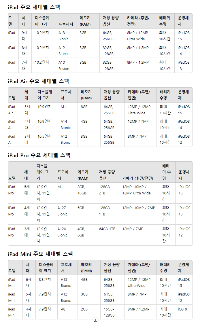 | iPad Mini | 6세대 | 8.3인치 | A15 Bionic | 4GB | 64GB, 256GB | 12MP / 12MP Ultra Wide | 최대 10시간 | iPadOS 15 |